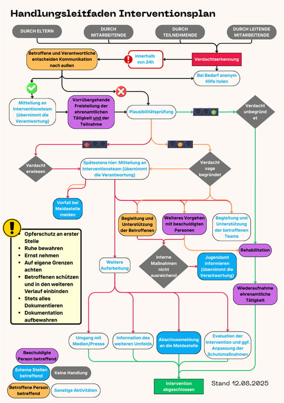 Unser Interventionsplan beschreibt, wie wir im Ernstfall vorgehen: von der ersten Wahrnehmung über die interne Meldung bis hin zur professionellen Unterstützung durch Fachstellen. Er stellt sicher, dass Betroffene geschützt, Grenzen gesetzt und notwendige Maßnahmen verantwortungsvoll getroffen werden. Der Plan bietet allen Mitarbeitenden Orientierung und Handlungssicherheit.